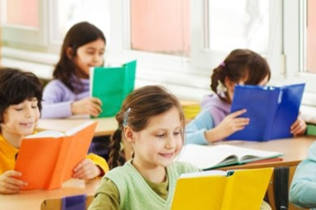 Children learn basic alphabets, numbers, rhymes, writing skills, and creative activities.